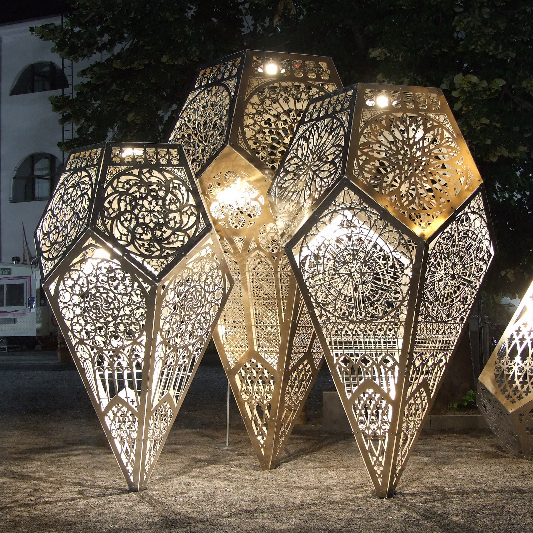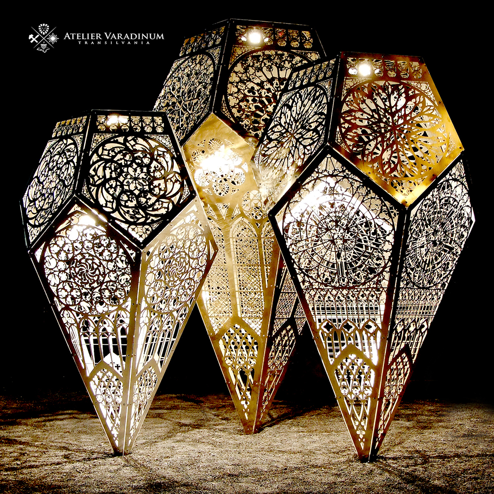 Aceasta instalatie este realizata din placi de aluminiu de 2mm grosime, debitate cu jet de apa. Elementele rezultate sunt imbinate sub forma a trei structuri poliedrale derivate din cadrul poliedrelor regulate. Fiecare din cele trei structuri are cate unsprezece fete plane pe care se regasesc motive folosite la decorarea unor catedrale gotice. Acestea sunt articulate intre ele formand un cadru stabil de tripod.