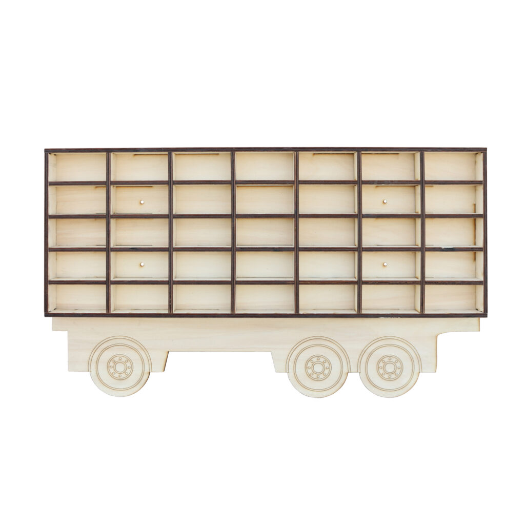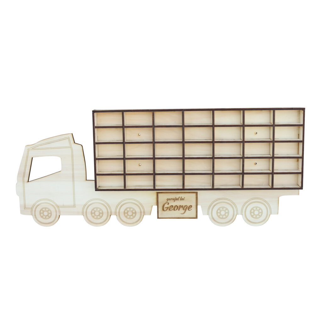 Realizat integral din placaj de plop 8mm, camionul „transporta” 35 masinute.